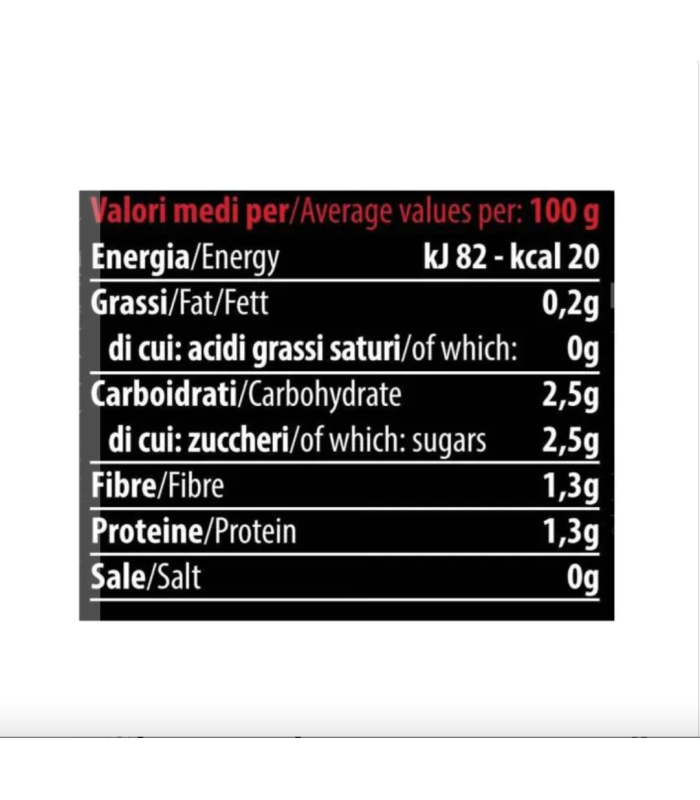 Energia 82 kcal Grassi 0,2 gr. Grassi Saturi 0 gr. Carboidrati 2,5 gr. Zuccheri 2,5 gr. Fibre 1,3 gr. Proteine 1,3 gr. Sale 0 gr.